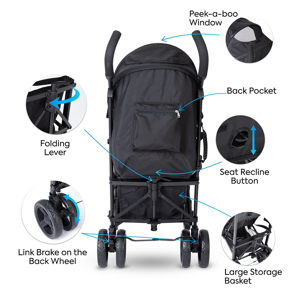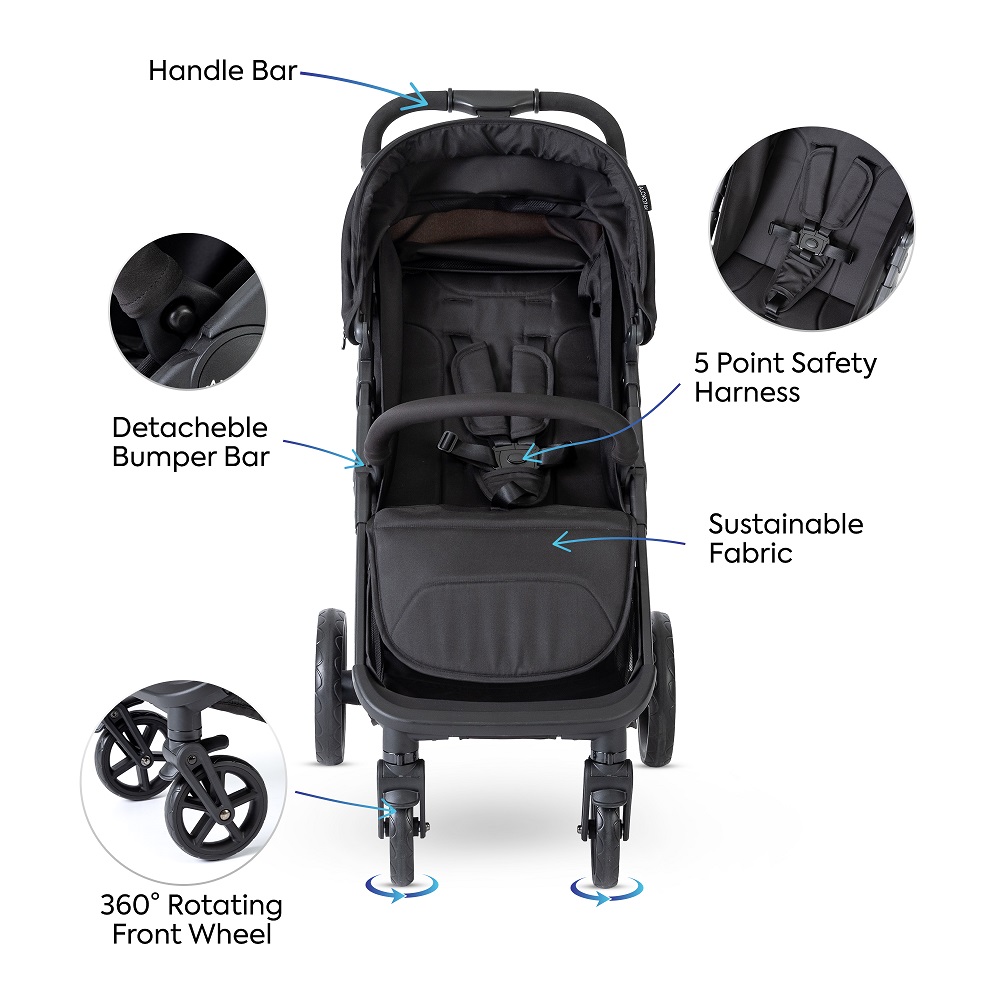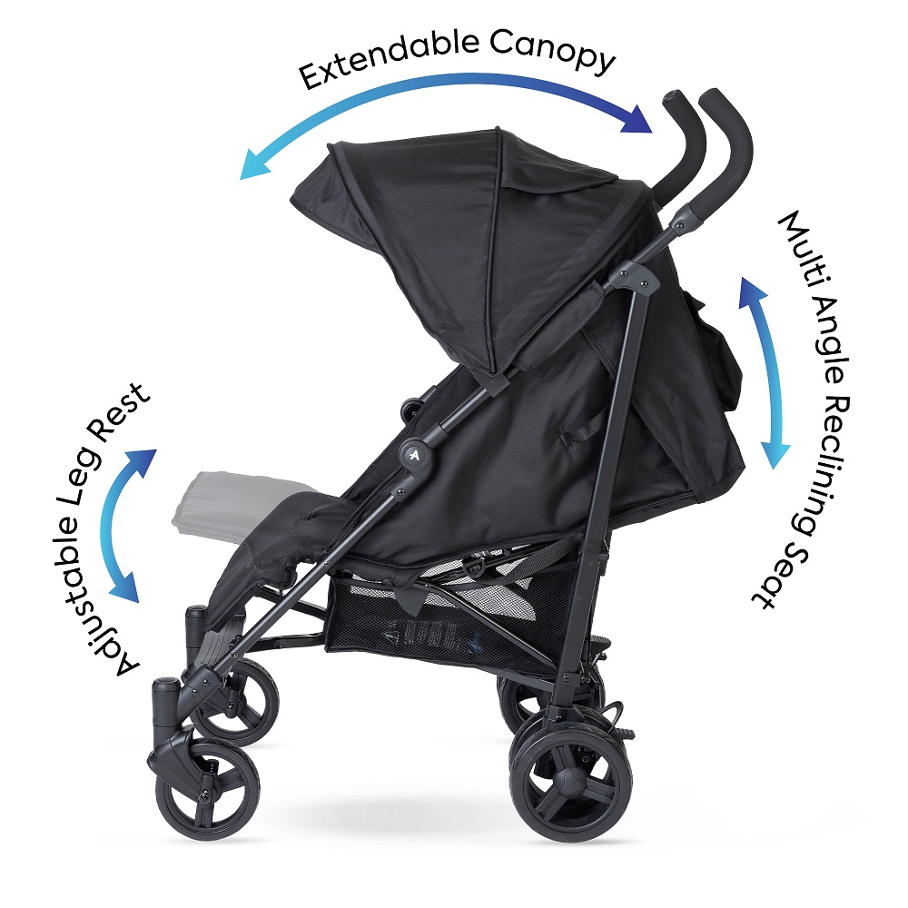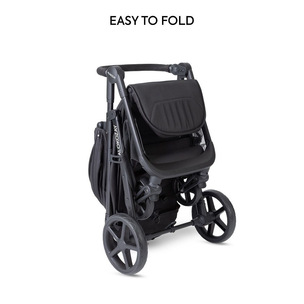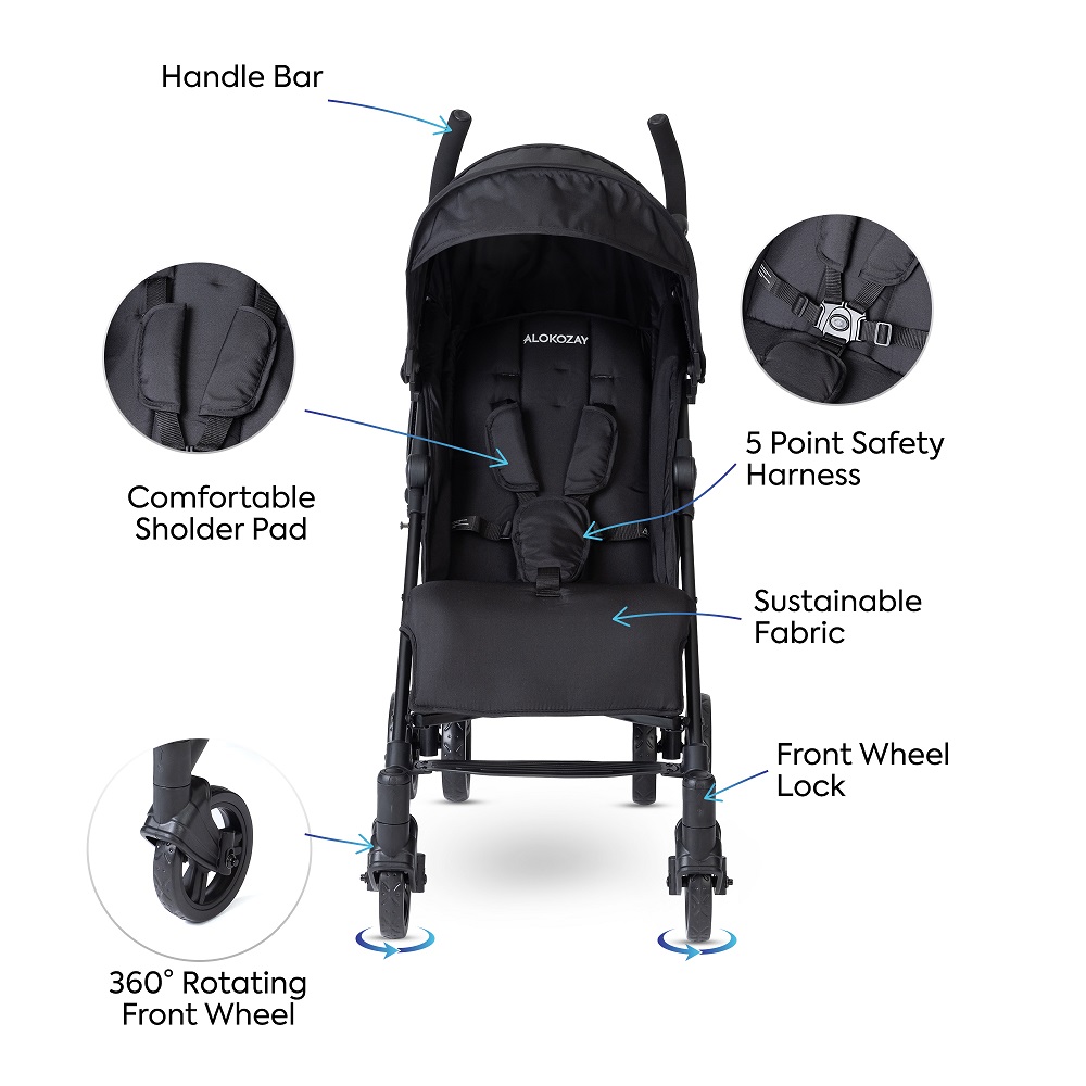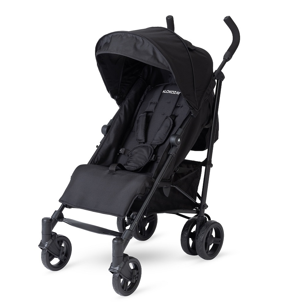 The Alokozay Baby Stroller is designed with care to provide comfort and convenience for both you and your little one. Perfect for children weighing up to 22kg, it comes with a spacious, sturdy storage compartment to hold all your essentials effortlessly. The 5-point adjustable seat belt keeps your baby safe, while the thoughtful one-foot double brake and rear wheel lock enhance security. With an adjustable canopy, and a reclining seat that shifts from sitting to lying mode, along with a cosy leg rest, your baby will feel at ease. Plus, it's super easy to fold and unfold in just seconds, and the detachable guardrail conveniently folds with the stroller frame for hassle-free portability.